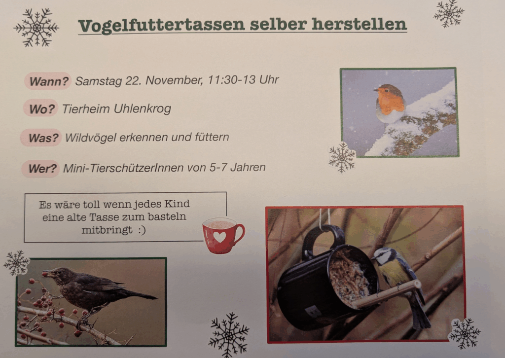 Diesen Samstag möchten wir gemeinsam mit interessierten Mini-TierschützerInnen spielerisch herausfinden welche Vögel eigentlich vor unserer Haustür leben und wie wir ihnen helfen können. Danach werden wir selber aktiv und kreieren unsere eigenen “Vogelfuttertassen” die später auf dem Balkon oder im Garten aufgehängt werden können.