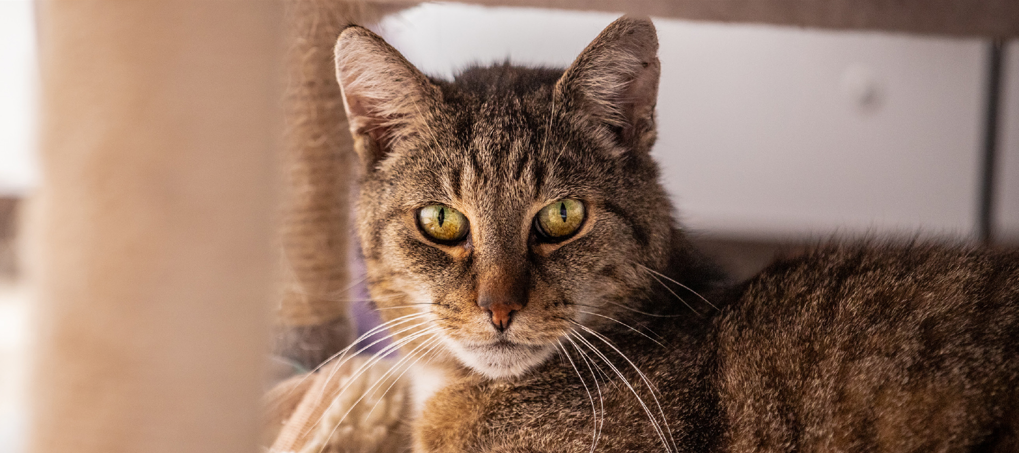 Hier bin ich nun unsicher, eingeschüchtert und unglücklich. Bei wenigen Katzenstreichlerinnen verlasse ich schon mal meine Höhle, wenn sie mich besuchen und tretel schnurrend vor mich hin. Manchmal schaue ich auch nur mit großen Augen zu, was sie da so treiben, um mich aus der Reserve zu locken. Und meistens träume ich davon, wieder ein richtiges Zuhause zu bekommen. Eins, wo ich ein bisschen meine Freiheit genießen darf? Denn in den uneingeschränkten Freigang darf ich leider nicht mehr, weil ich FIV-positiv getestet worden bin. Das ist nicht weiter schlimm für euch Menschen – ich könnte nur Artgenossen damit anstecken – und auch nur, wenn wir uns prügeln – doch nichts liegt mir ferner! Denn ich bin ein durch und durch freundlicher Kater. Miau! Ich muss mir übrigens früher mal das linke Hinterbein gebrochen haben, denn es ist etwas schief zusammengewachsen. Deshalb habe ich ein bisschen Arthrose im Knie. Doch mit der kleinen Schiefstellung komme ich prima zurecht.