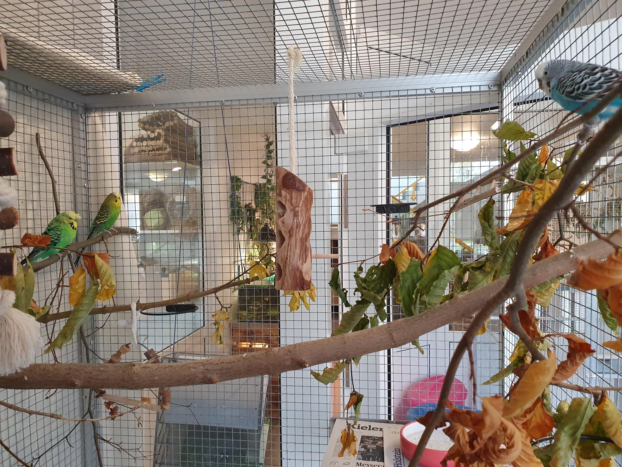 Das Personal hat uns eine schöne, große Voliere zur Verfügung gestellt. Ist auch muckelig warm jetzt hier drinnen.